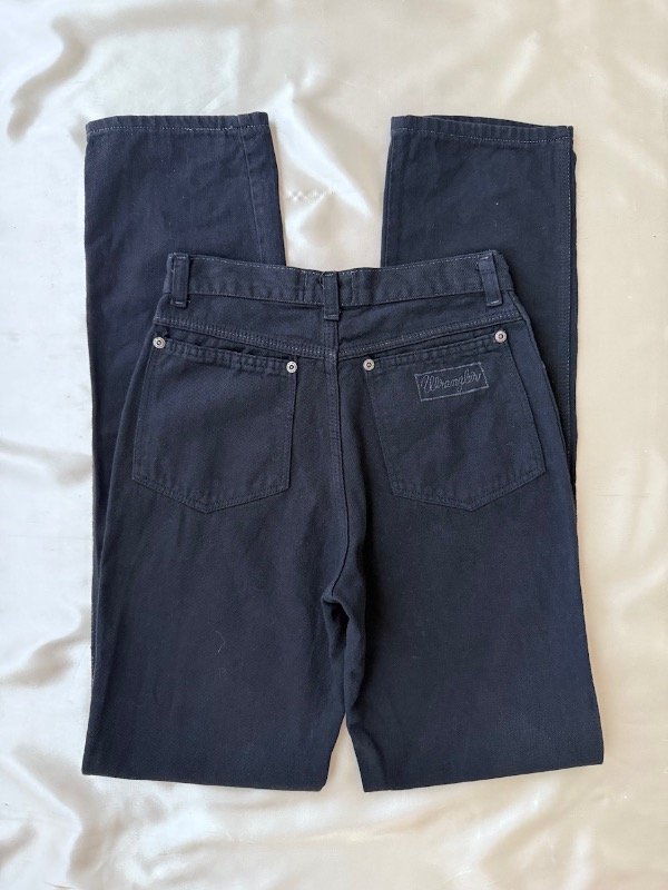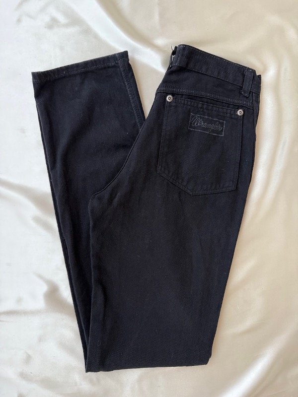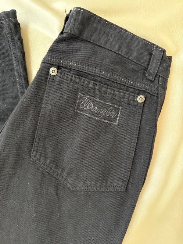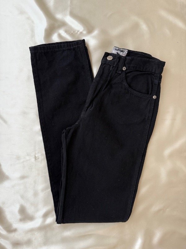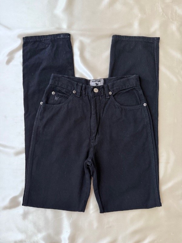 Este modelo es negro corte clásico recto, rígido porque no elastiza pero es un jean más liviano blando que otros de la época, tiene la marca bordada en uno de sus bolsillos traseros y una W en el bolsillito delantero