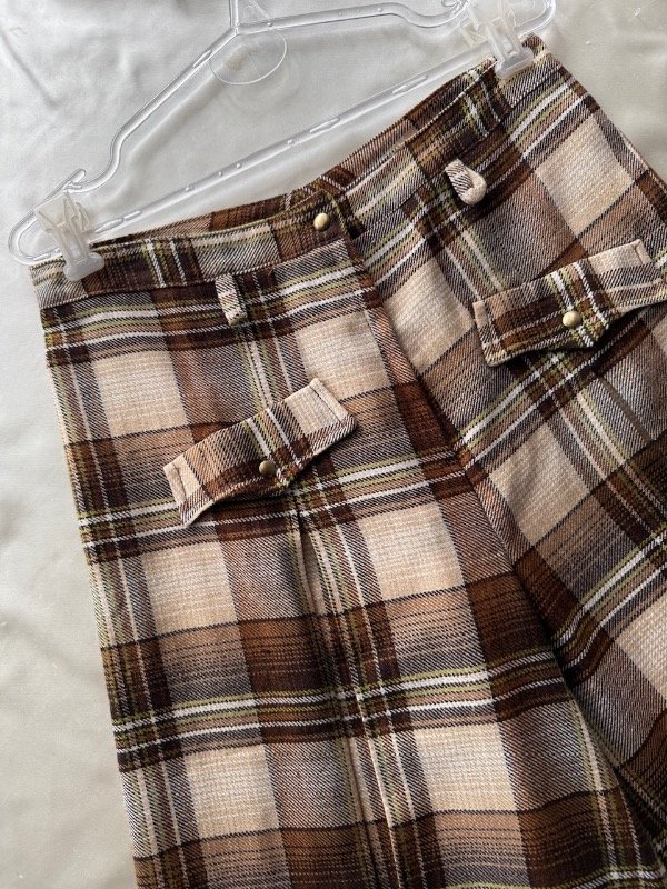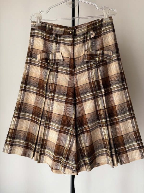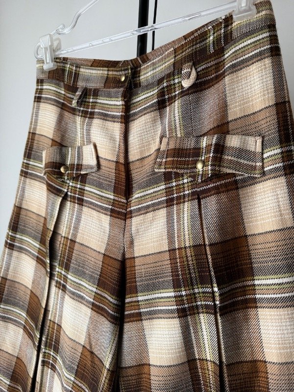 Pollera pantalón vintage escocesa en tonos marrones, largo medio, con tablas