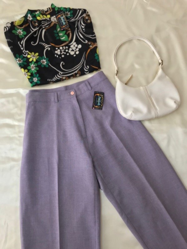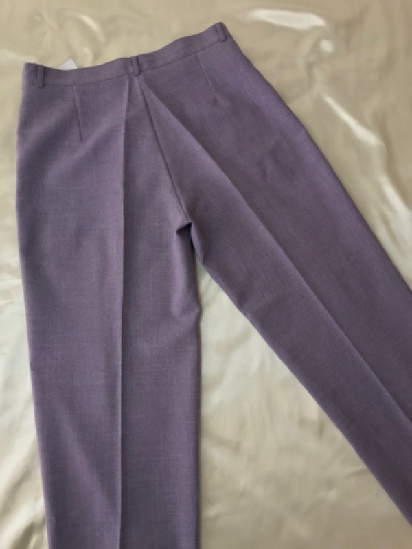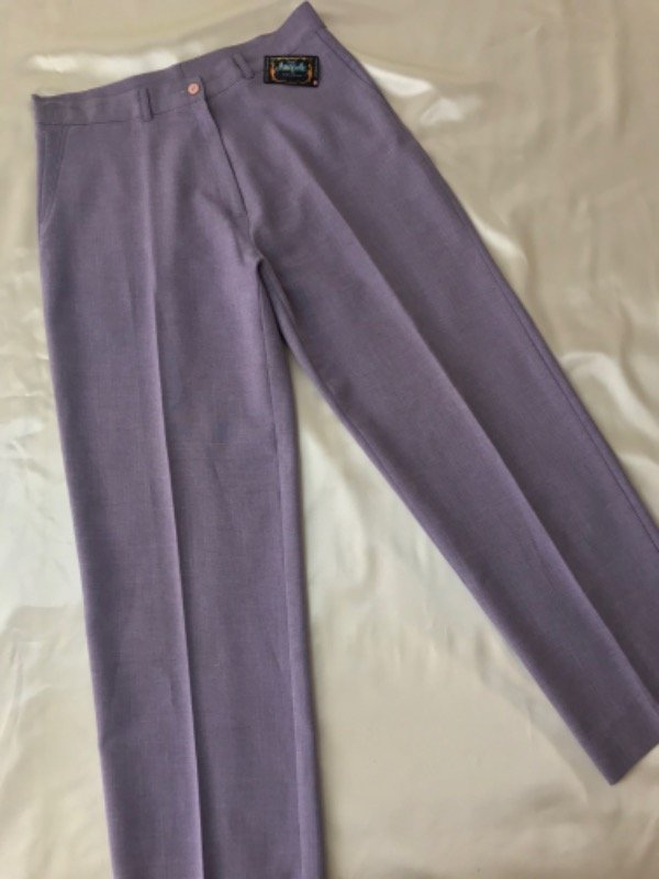 Pantalón sastrero vintage color lila, tiene falso bolsillos, cintura alta y es recto