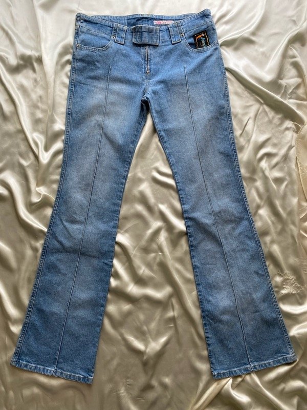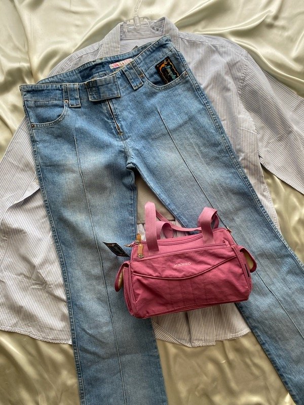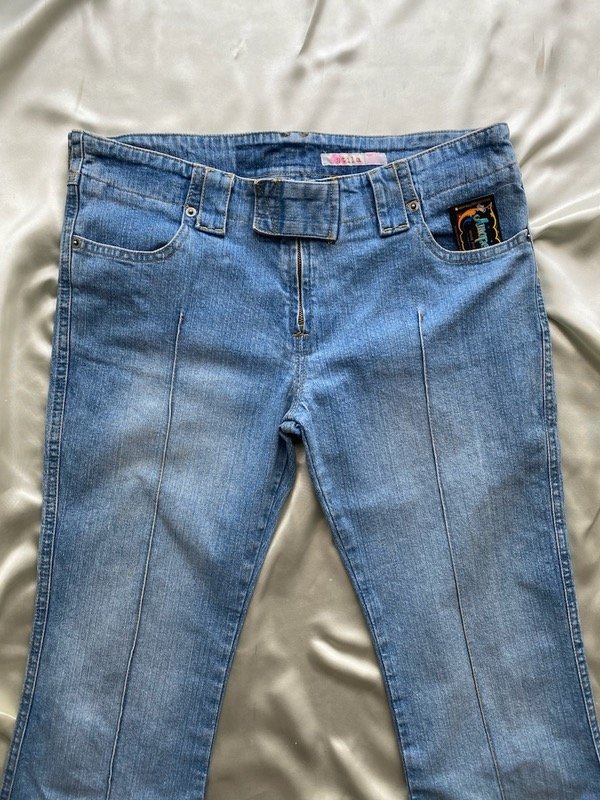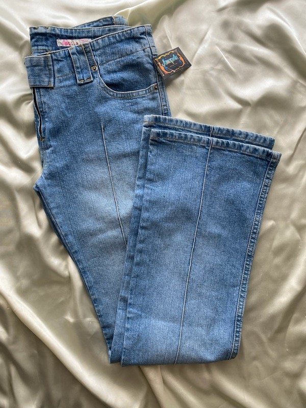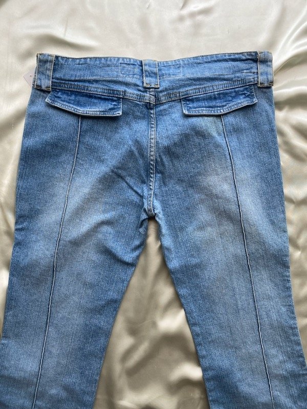 Jean elastizado tiro medio con cintura ancha y alforzas, tiene bolsillos delanteros y botamanga ancha talle aproximado 38/40