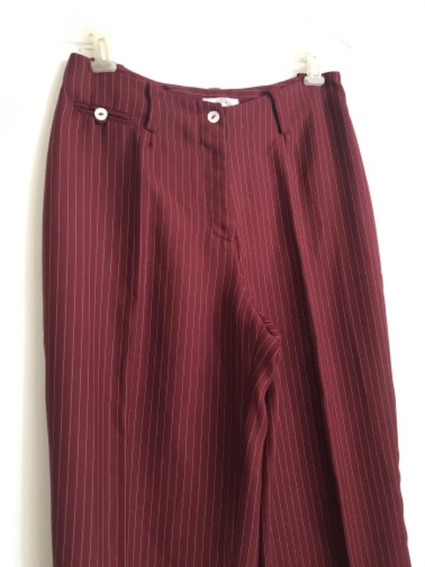 Pantalón sastrero Ted Bodin talle 44 (de vestir) liviano, el genero parece una gasa pero con peso, linda caída y no transparenta, color bordo con rayitas blancas, botones de nacar, excelente calce