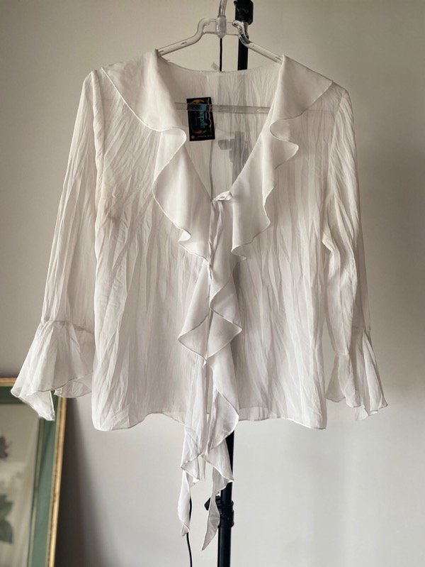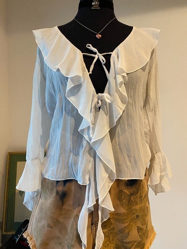Blusa de gasa simple, con jabot y mangas en picos, se cierra solo con dos tiritas atadas, talle 3