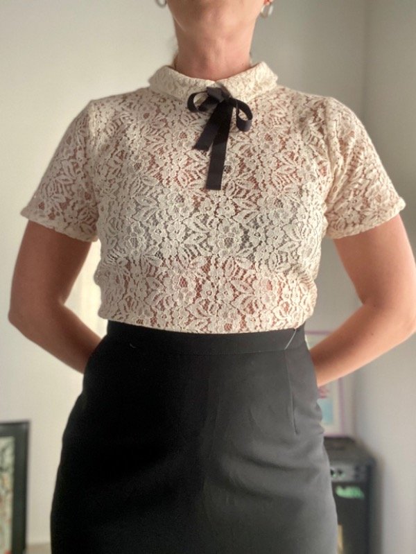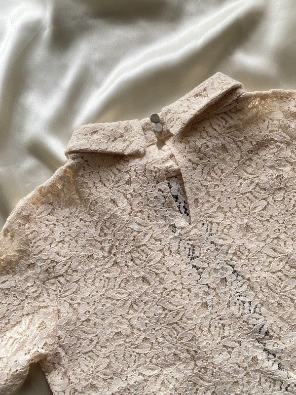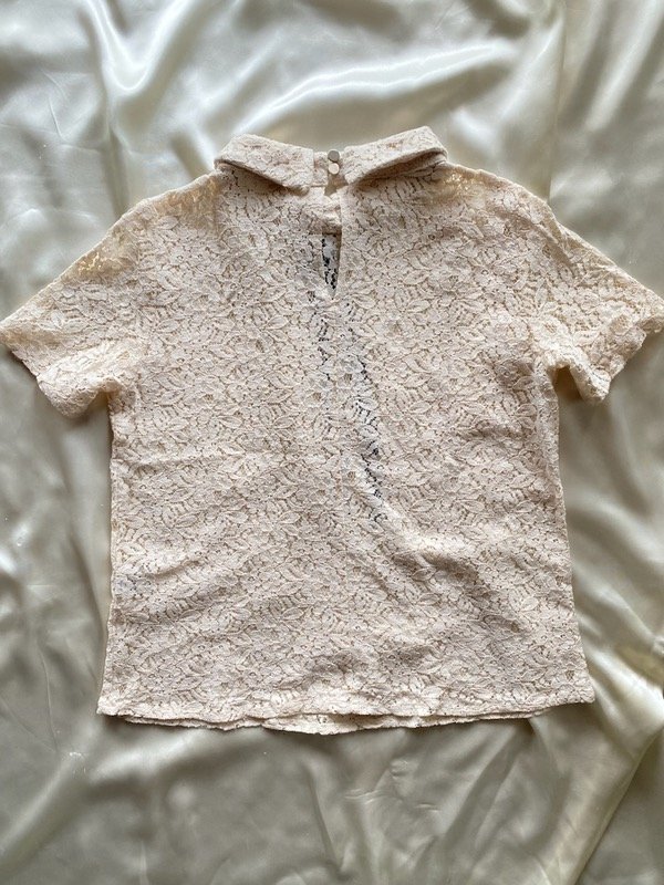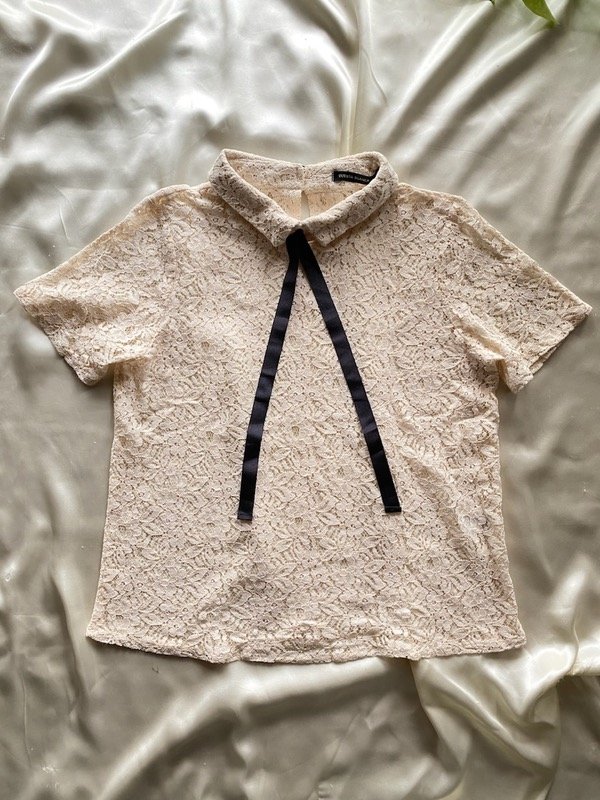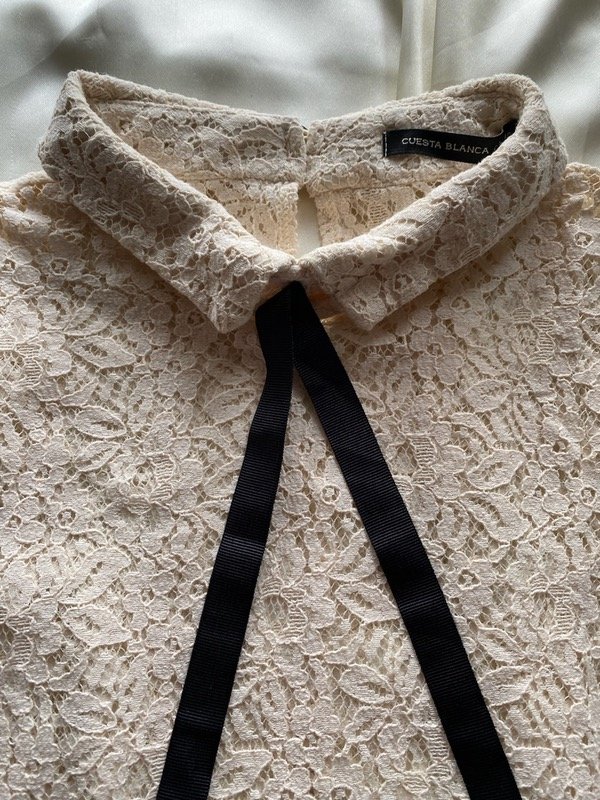 Remera de jiupur con cuello y lazo para hacer moño y espalda con ojo y 2 botones, color crudo, marca Cuesta blanca segunda mano