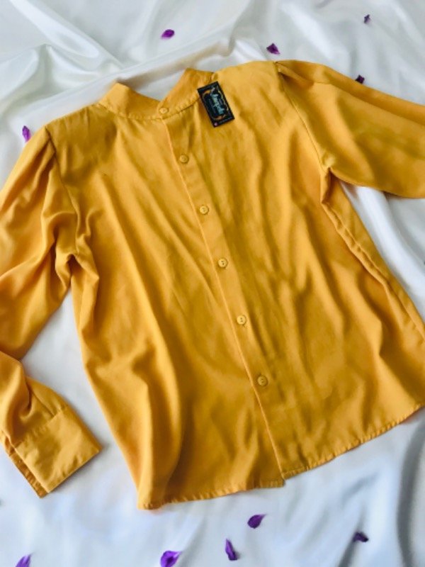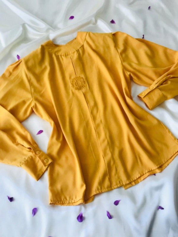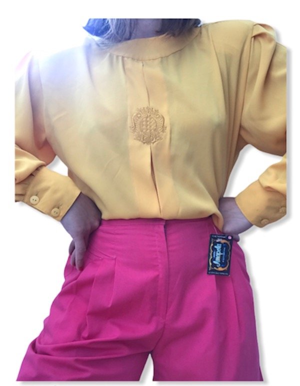 Blusa vintage cuello redondo bordada en frente y abotonada en espalda, con pinzas en hombros y puños, con hombreras