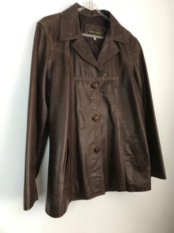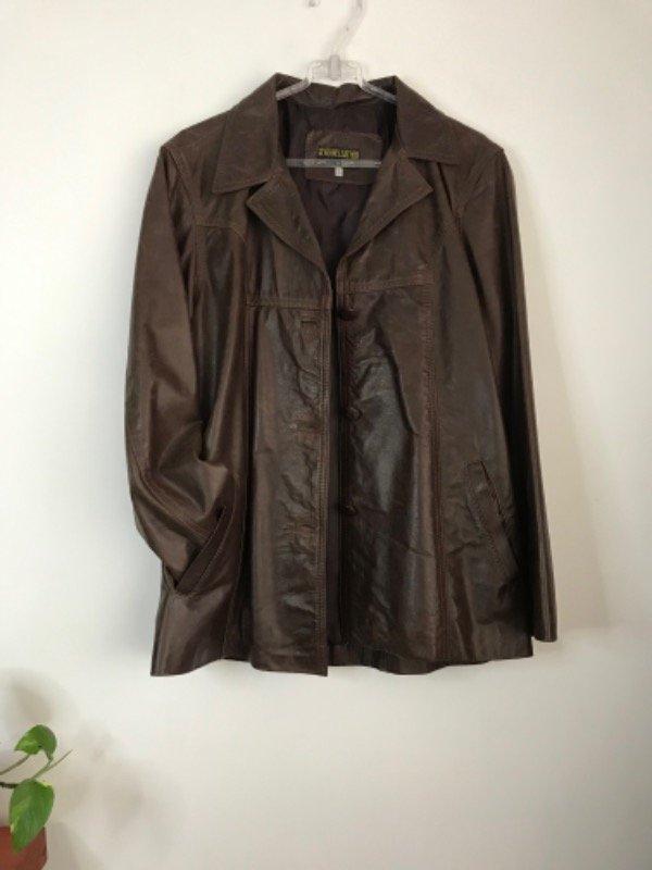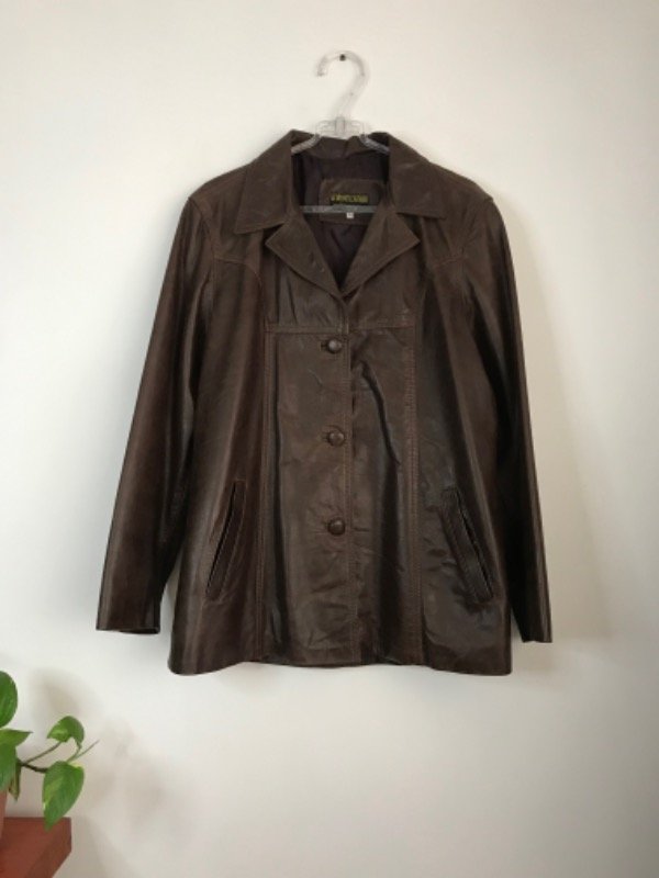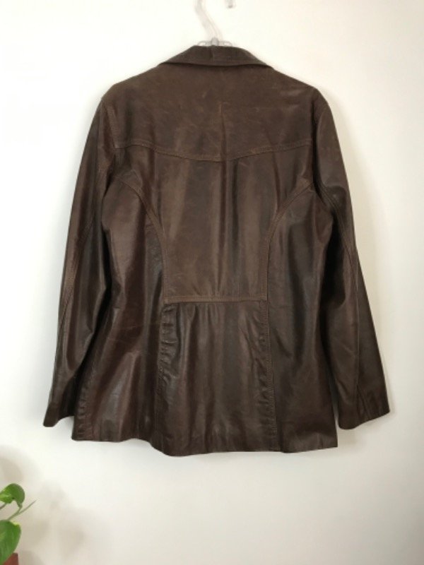 Chaqueta de cuero genuino marrón, vintage, largo medio, apenas entallada, botones forrados en excelente estado de conservación