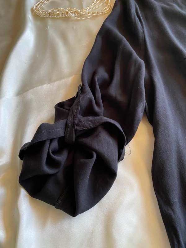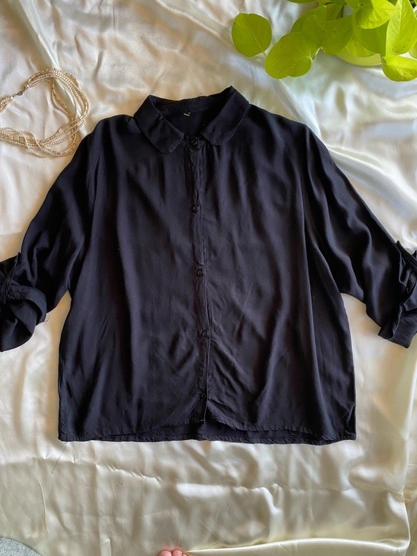 Camisa secondhand de fibrana negra, super liviana tiene un cuellito redondeado muy lindo, corte cuadrado no es entallado manga sin puño con precillas para sujetar, super canchera