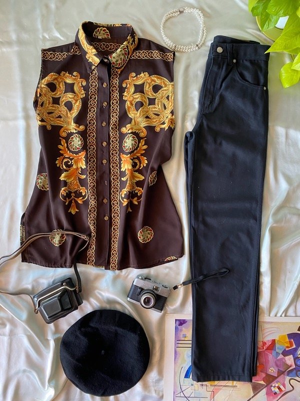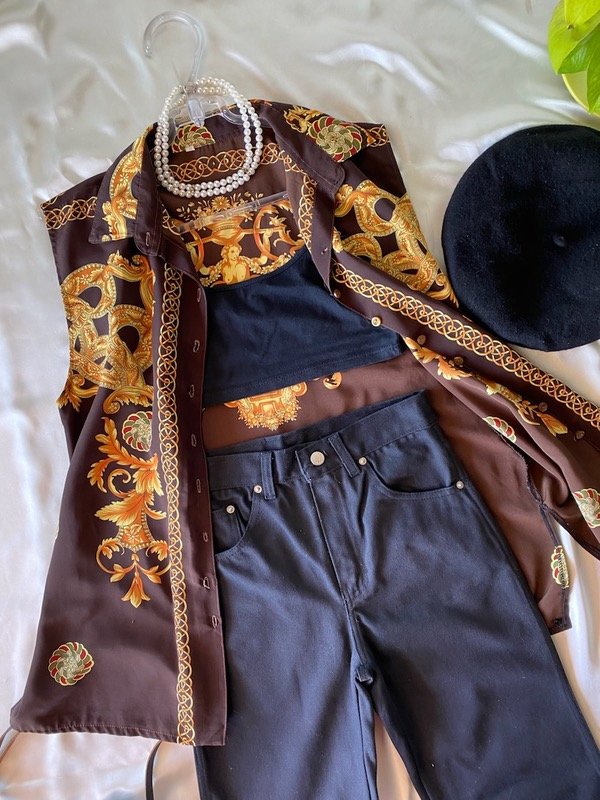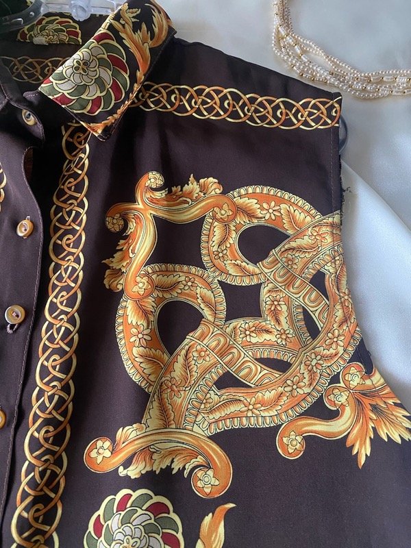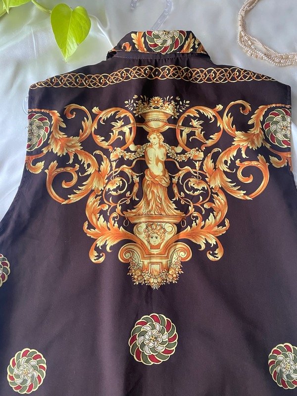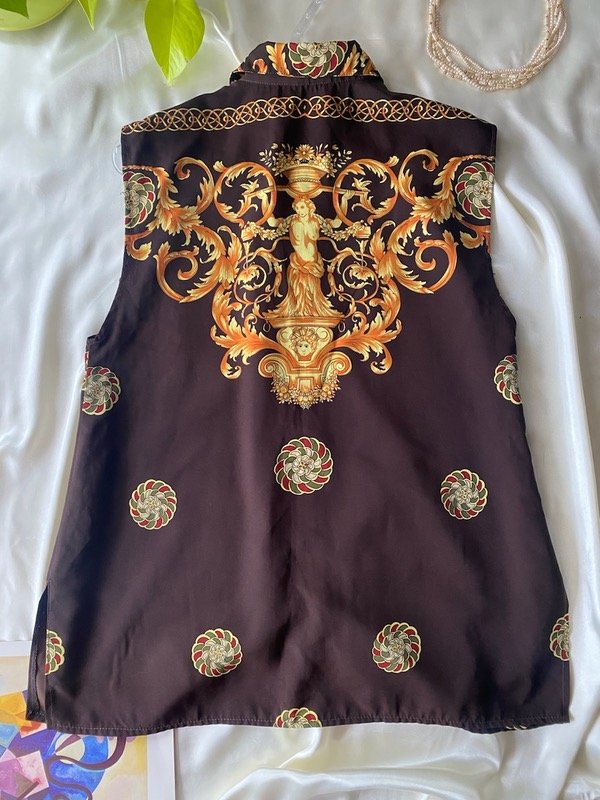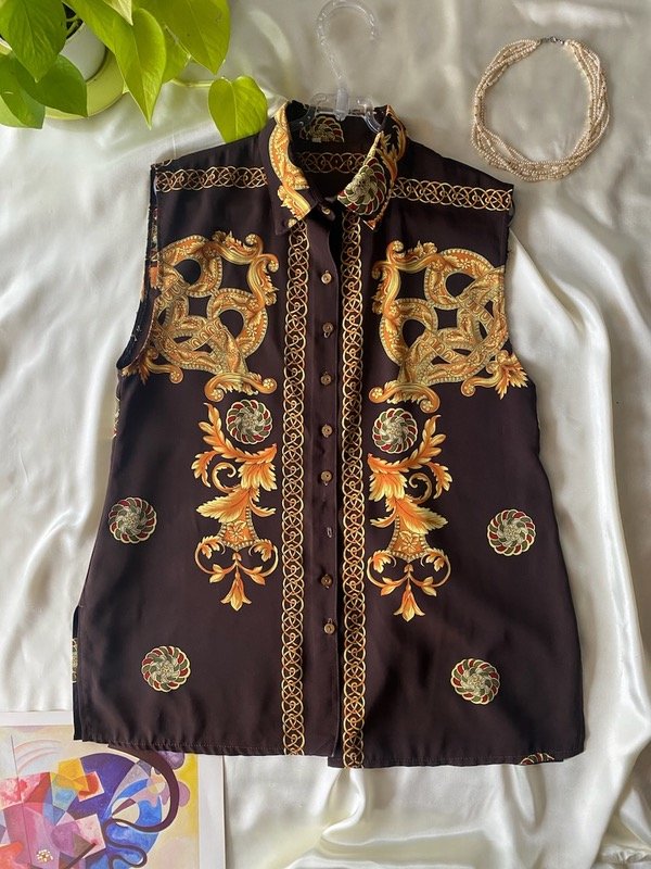 Camisa vintage marton chocolate con el promt muy versecesco en dorado, sin mangas, larguita