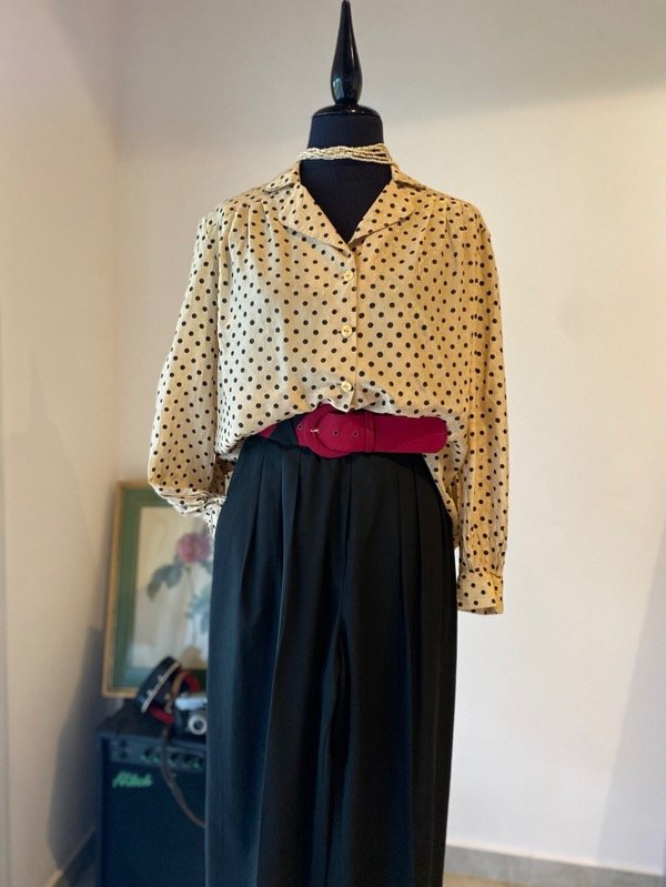 Camisa vintage beige algo brillosa con lunares negros, pinzada en hombros