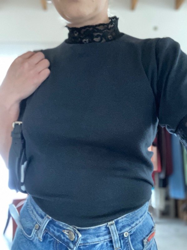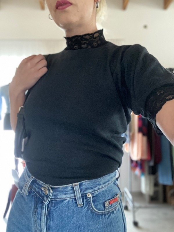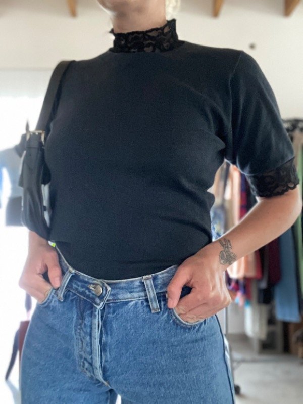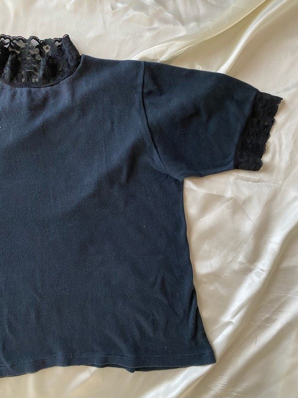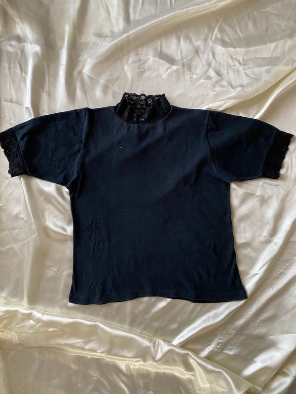 remera vintage puro algodón negro gastado, con puntilla en cuello y mangas, tela tubular sin costuras en los costados, cede