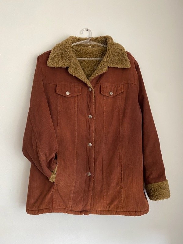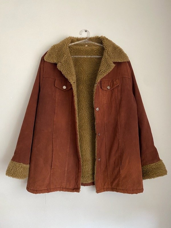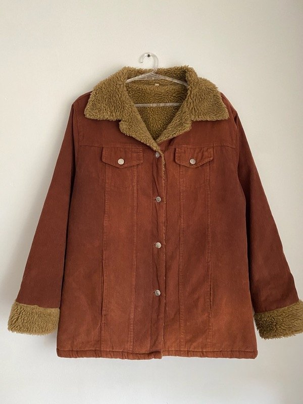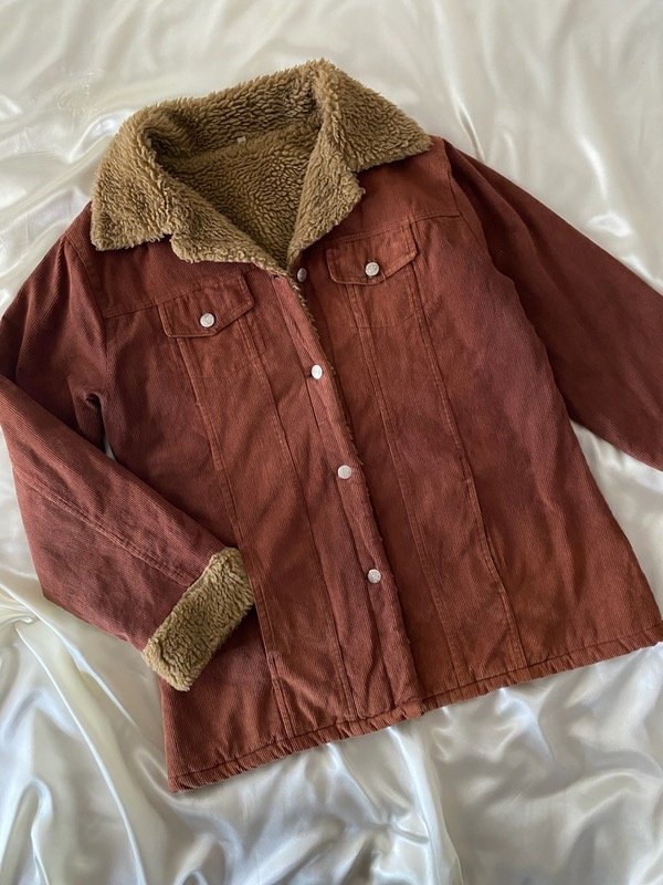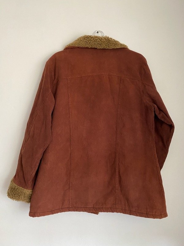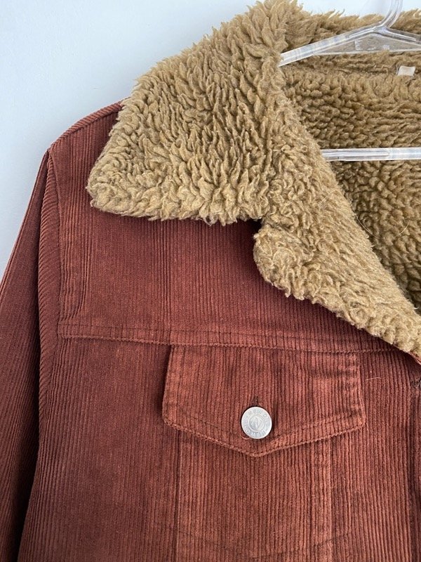 Campera vintage de corderoy chocolate con corderito impecable beige, con bolsillos talle L, corte recto