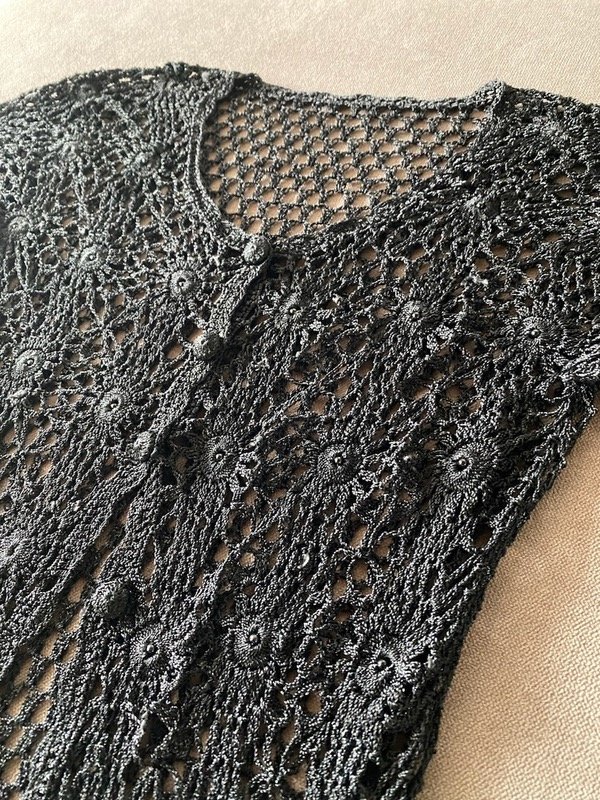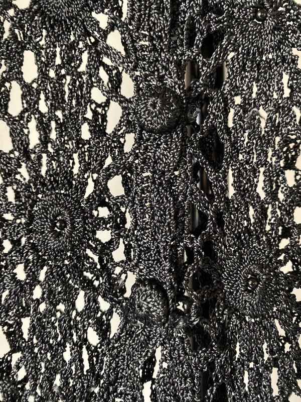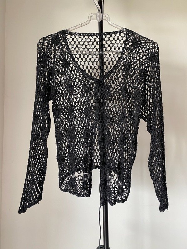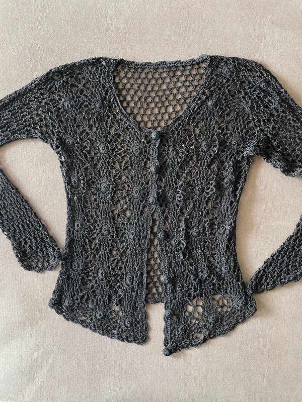 Cardigan tejido crochet con flores q en su interior tienen una mostacilla y el resto como si fuera red, con botones tejidos