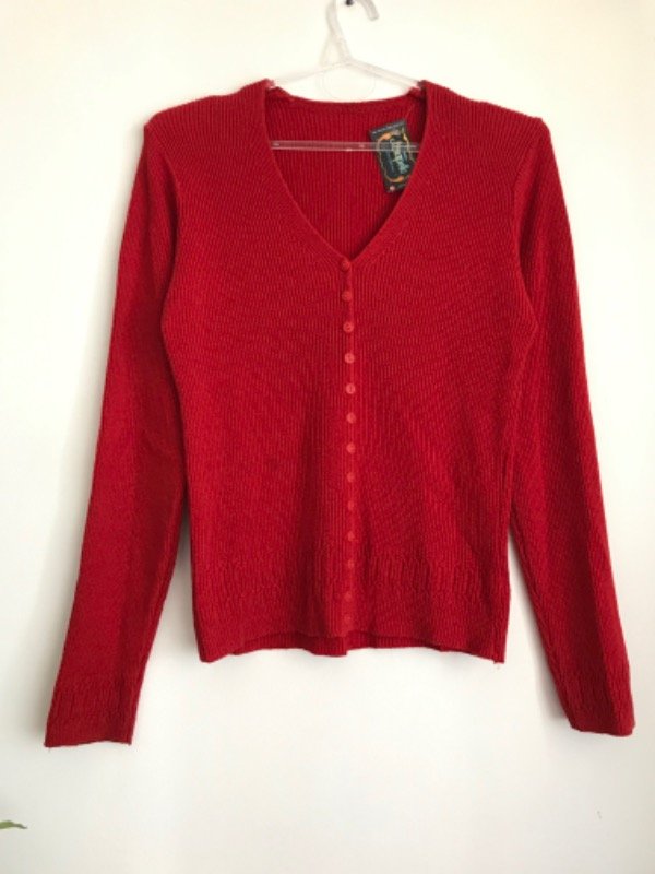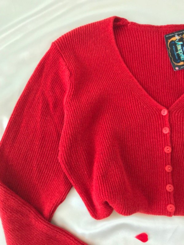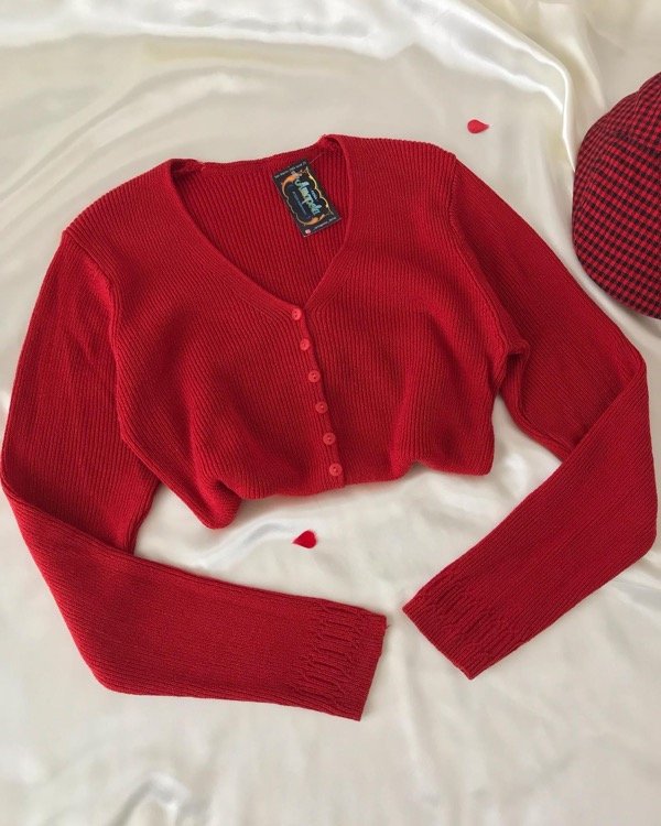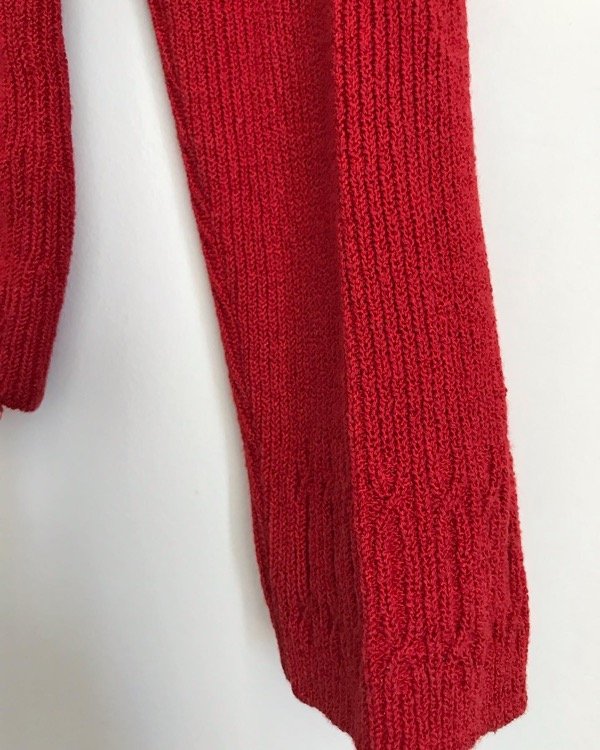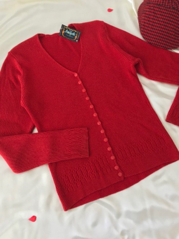 cardigan de hermoso hilo grueso y color rojo cereza, con detalle en puños y cintura