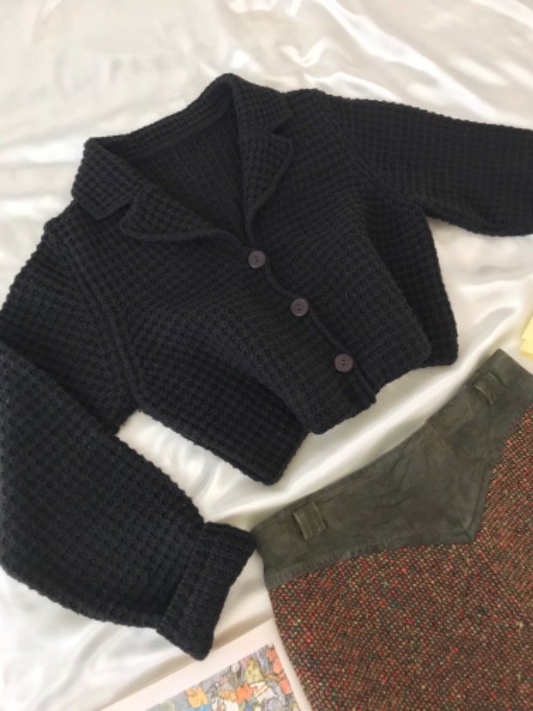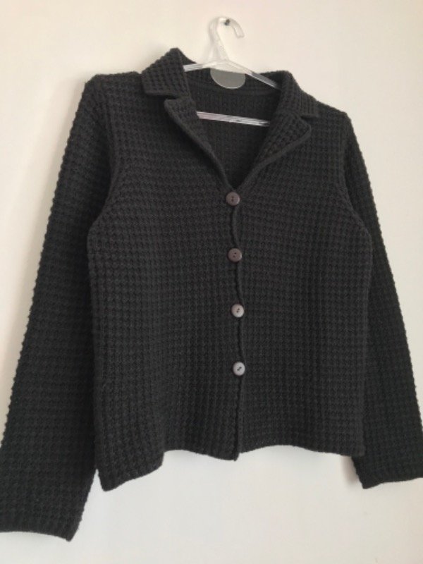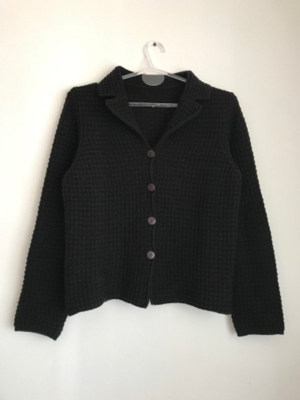 Cardigan negro, tejido como en cuadraditos,