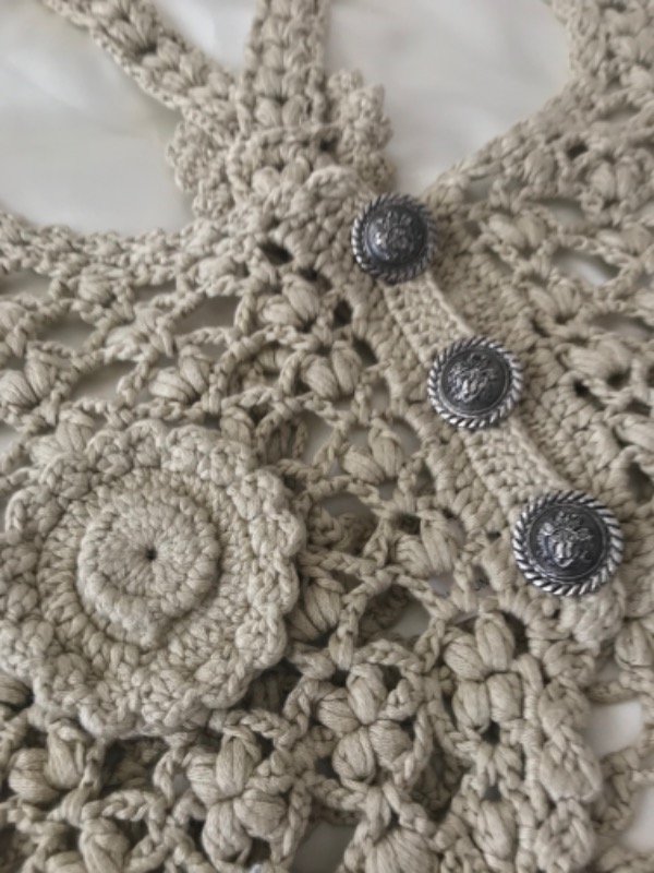 Chaleco tejido a mano, con capucha y espalda cruzada con una flor, hermosos botones
