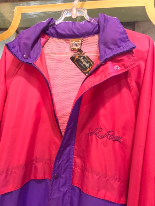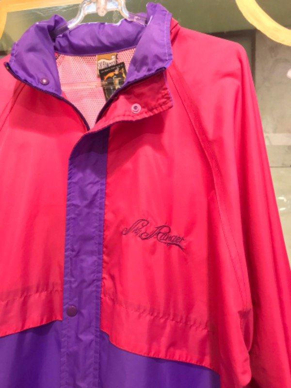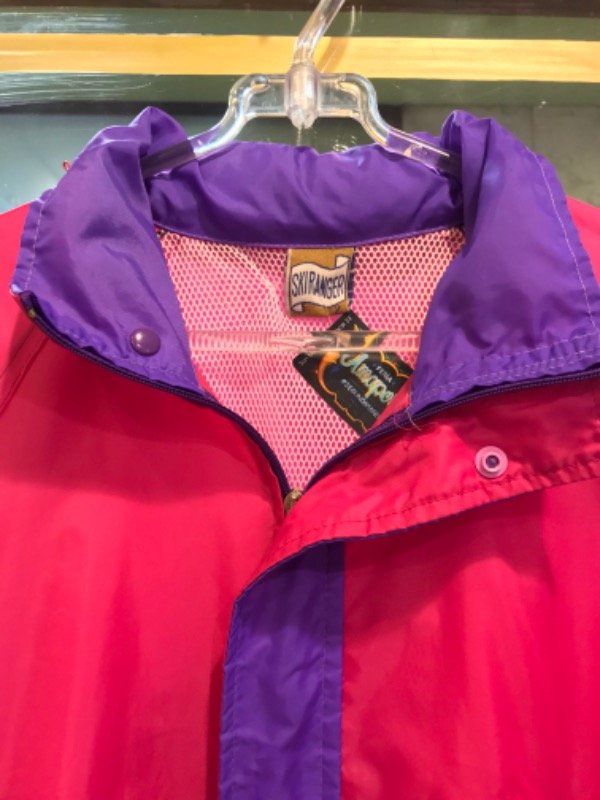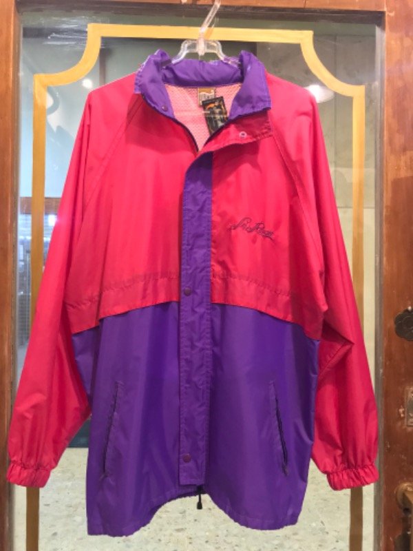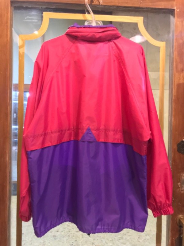 Rompeviento vintage casi sin uso, impermeable, fucsia y violeta, forrado con red en la parte de arriba, con bolsillos, cierre y broches, cordón para ajustar en cintura, capucha escondida en el cuello, talle 2 grande, manga rangla
