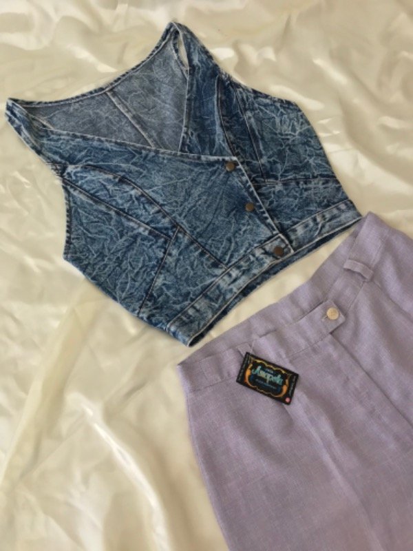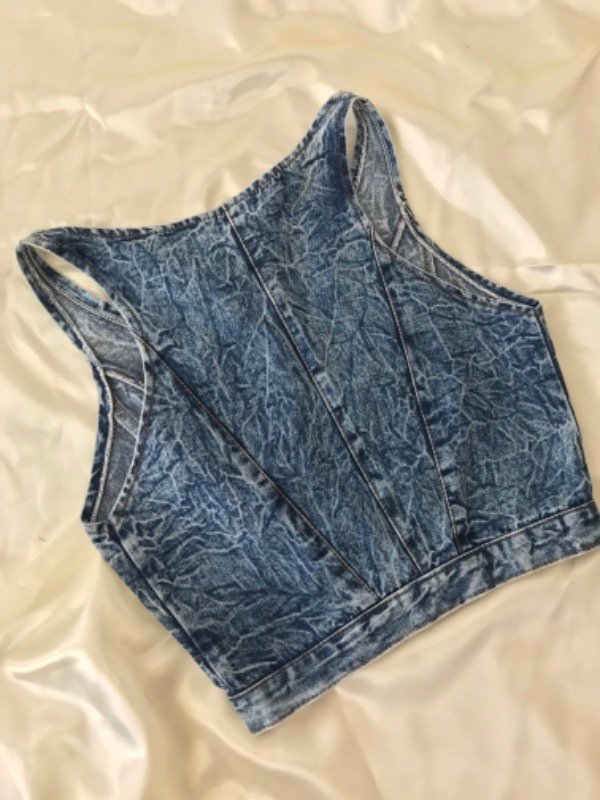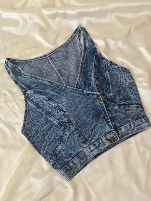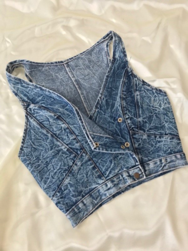 Top o bien chaleco de jean corto, cierre cruzado, queda hermoso abierto también, es rígido