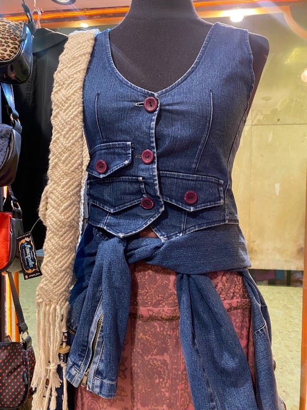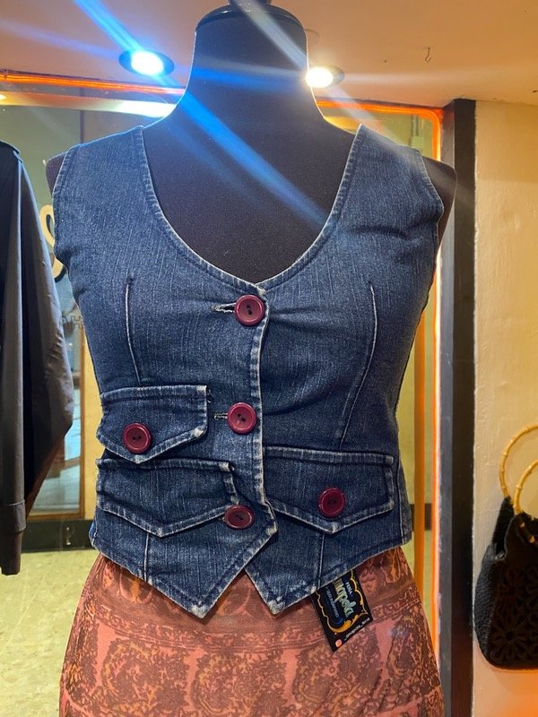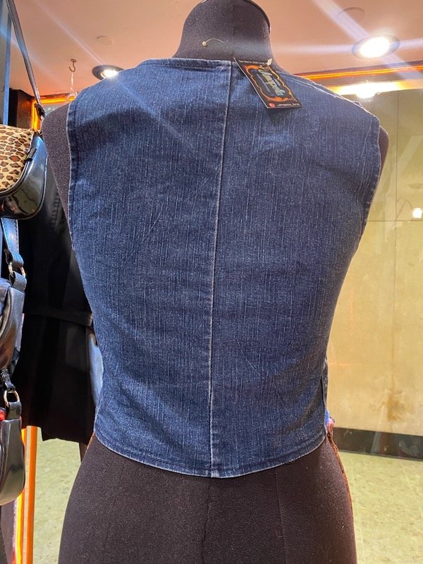 Chalequito de jean elastizado de los años 2mil, queda al cuerpo ideal para usar de top aunque es algo escotado