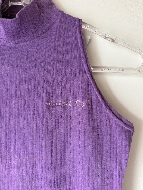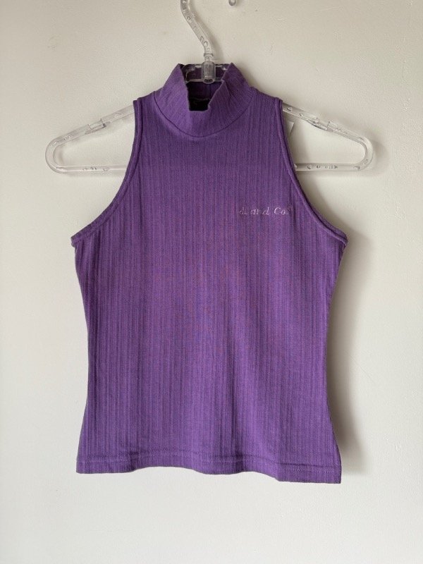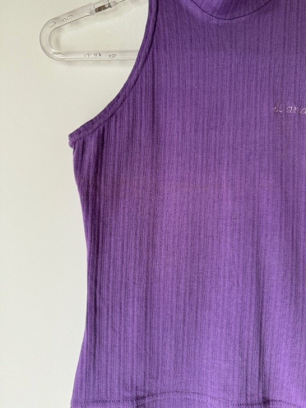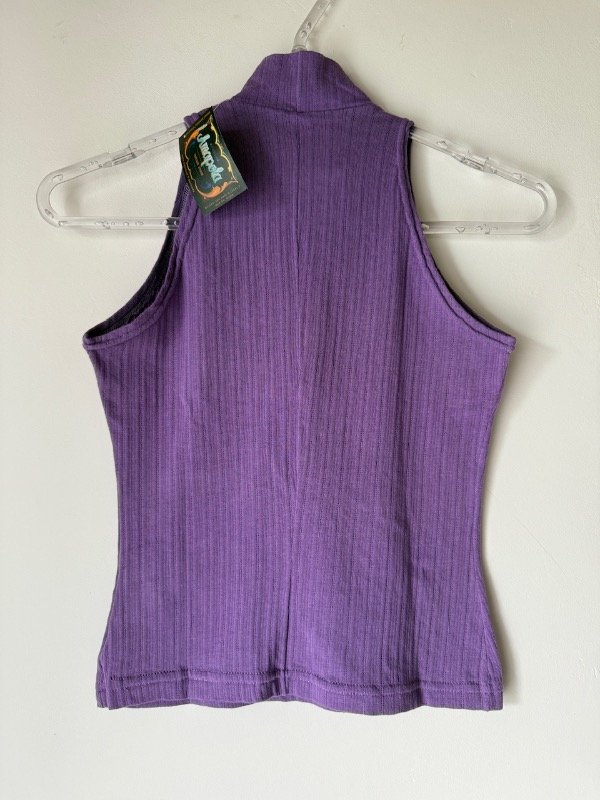 Top de algodón vintage *Dead stock 90s, violeta con cuello alto y corte musculosa q deja los hombros al descubierto, la tela tiene una textura de líneas verticales muy original