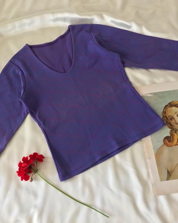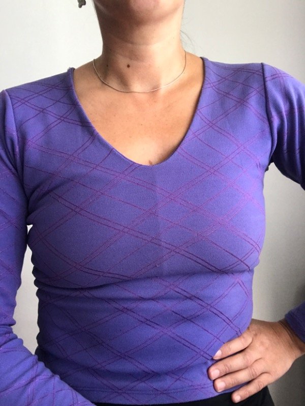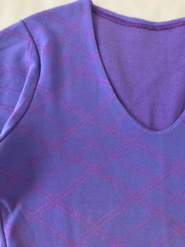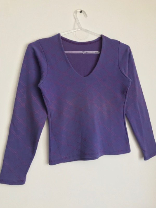 Remerita 2ndhand al cuerpo, violeta con sutil escocés, tela gruesa y elastizada talle S