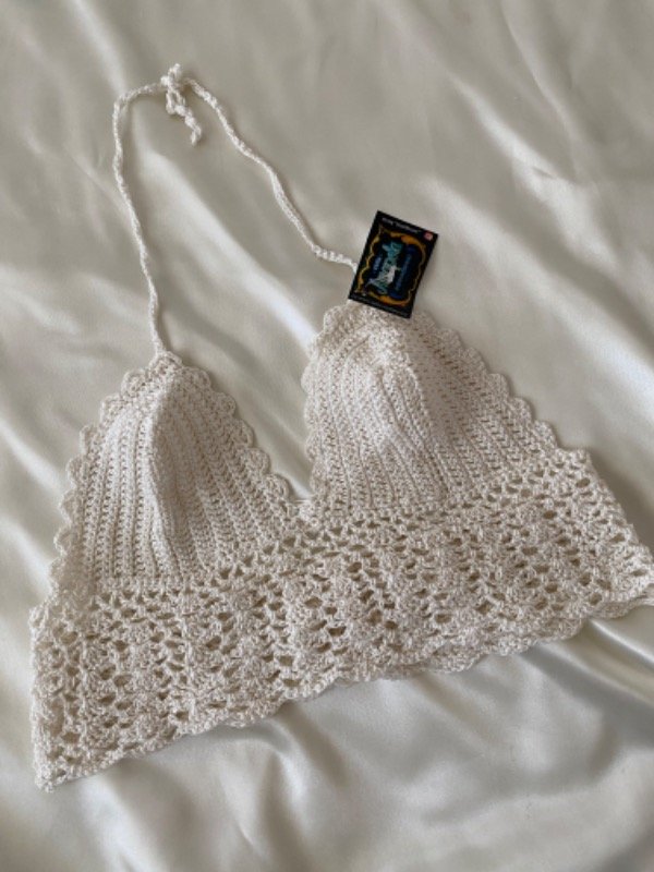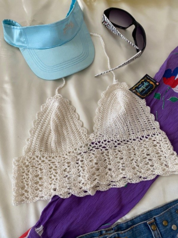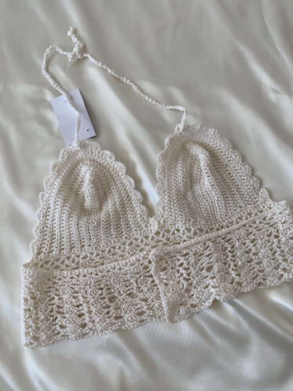 Topsito tipo bikini tejita en crochet para atra en cuello y botones en espalda