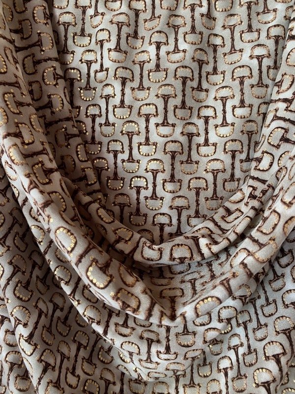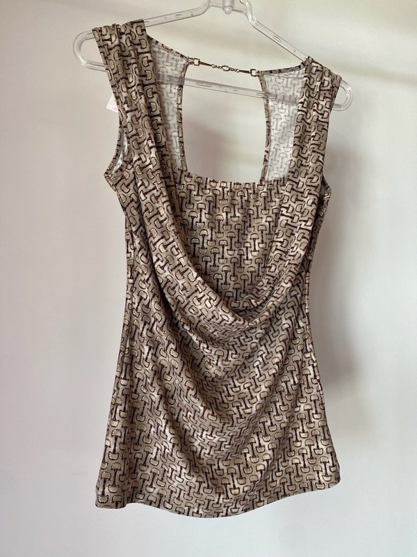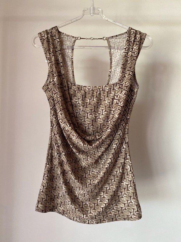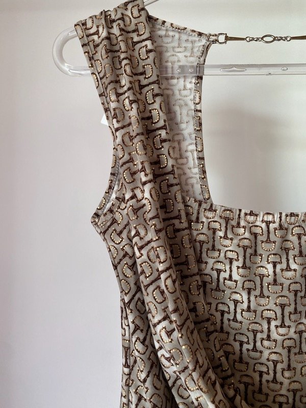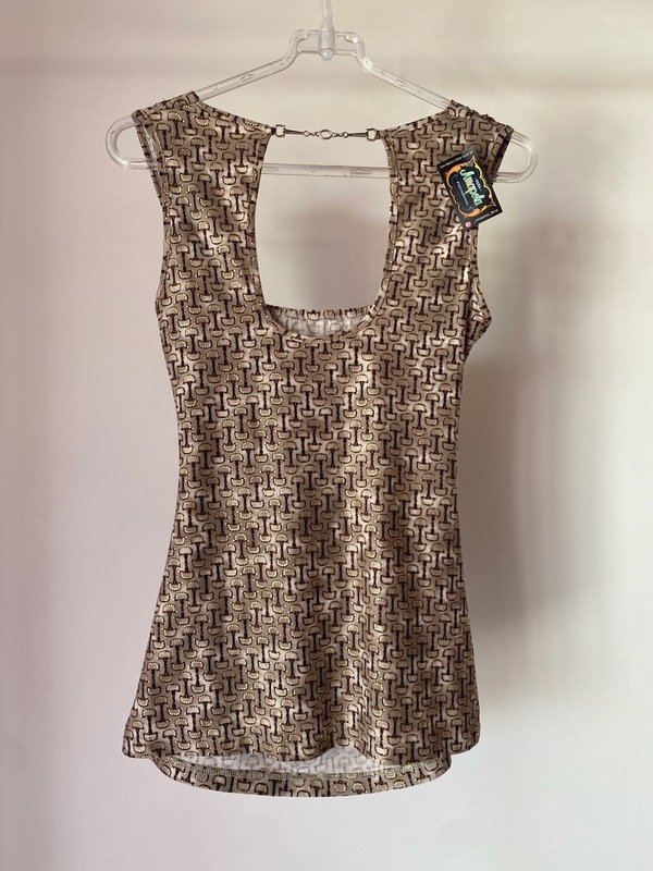 Top dosmilero con escote q cae , espalda con herraje y estampado con Toques dorados
