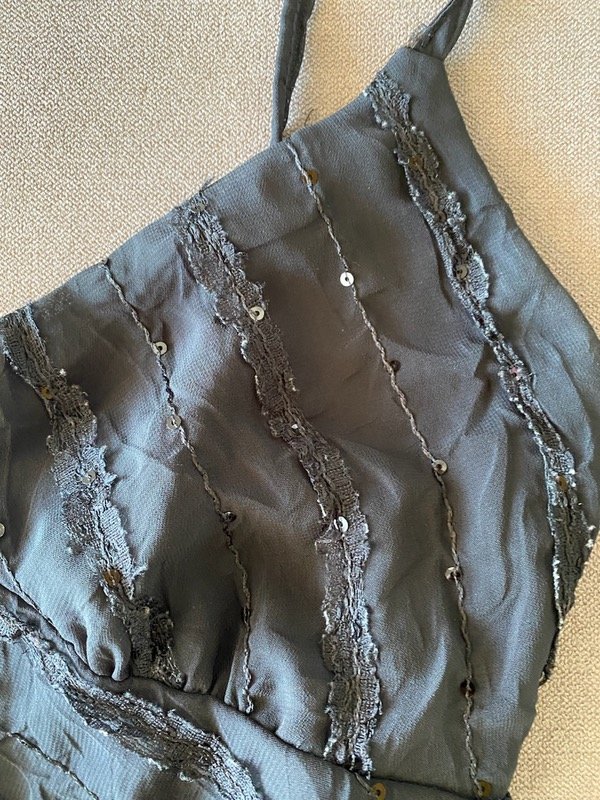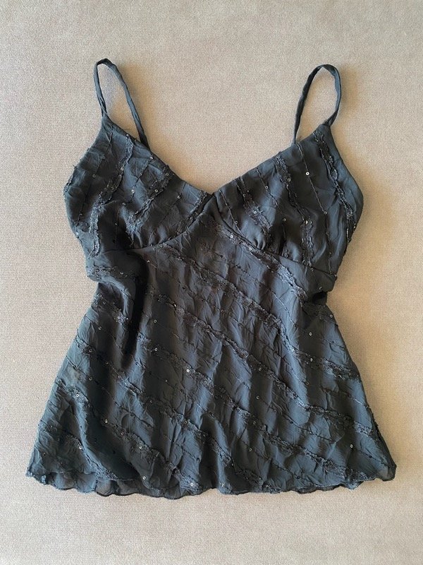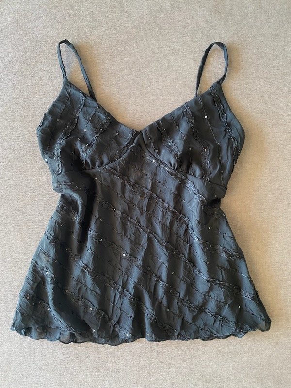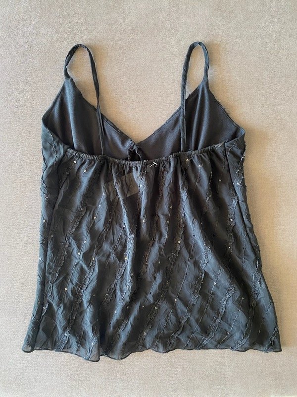 Top dosmilero de gasa con apliques de encaje y lentejuelas muy sutil, de triritas y corte triangulito en escote, elástico en espalda