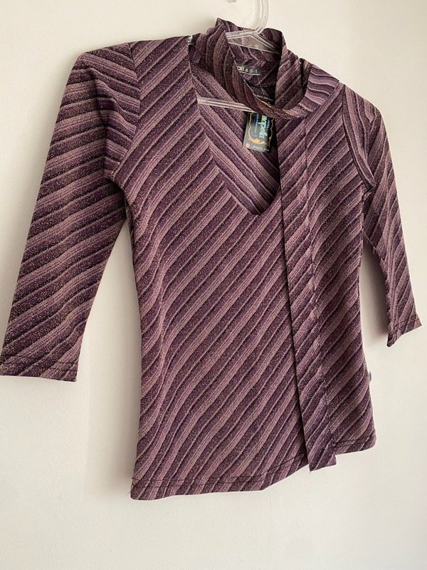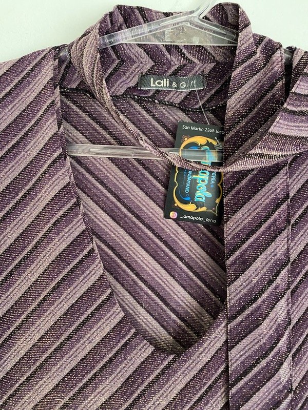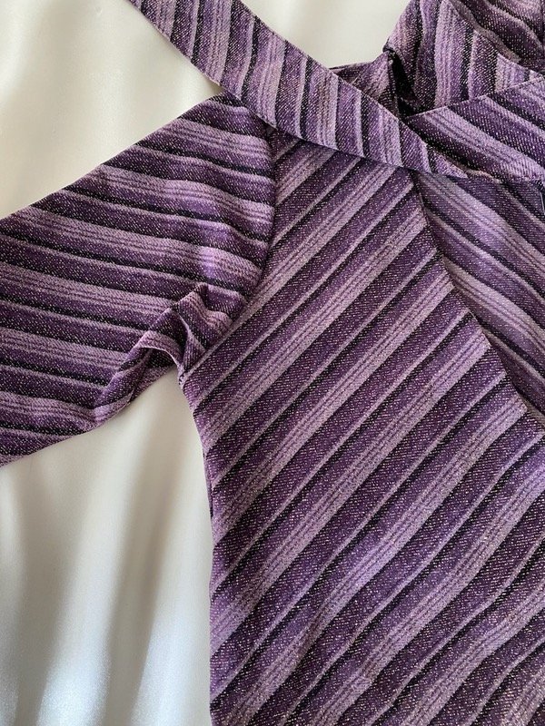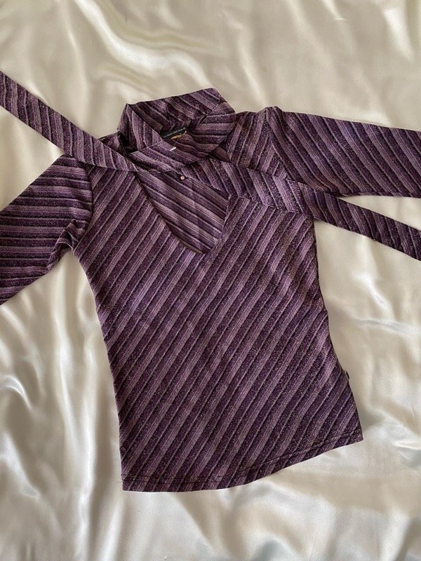 Top manga 3/4, y2k, rayado en colores violeta y lurex, elastizado con lazo en el cuello