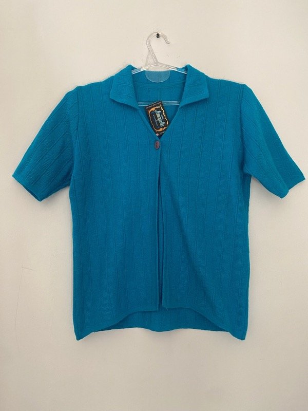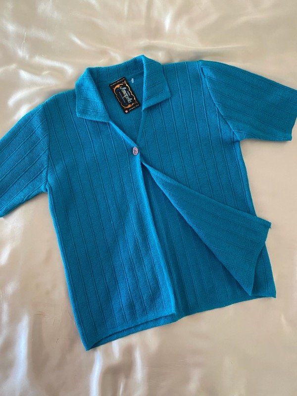 Top tejido folor turquesa con un solo botón, cuellito y manguita, muy #y2k