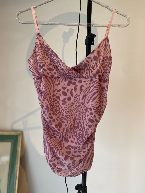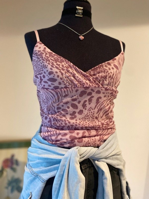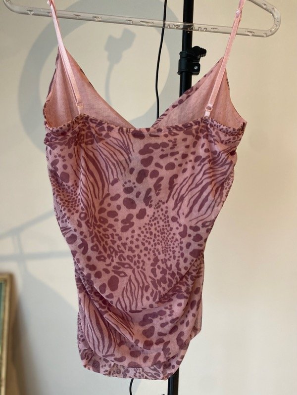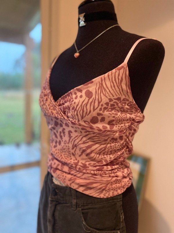 Top original de los años 00s de microtul estampado, forrado, con frunce a los costados, elastizado, talle M