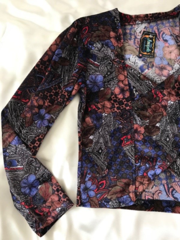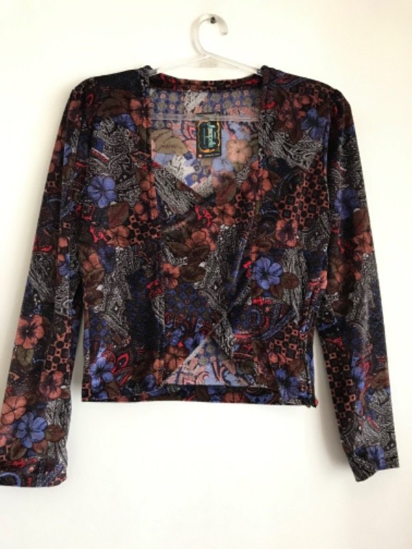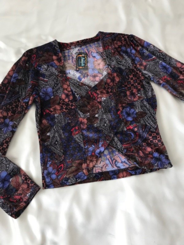 Top vintage de chiffon estampado manga larga, con mini hombrera, cierre de costado, cede un poco